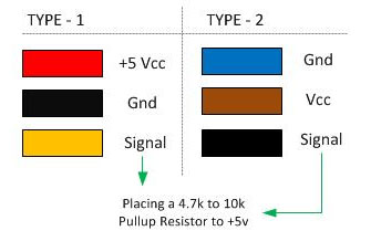 Sua conexão é realizada através de 3 pinos, e o sensor pode vir com dois padrões de conexão diferentes, como mostrado abaixo: